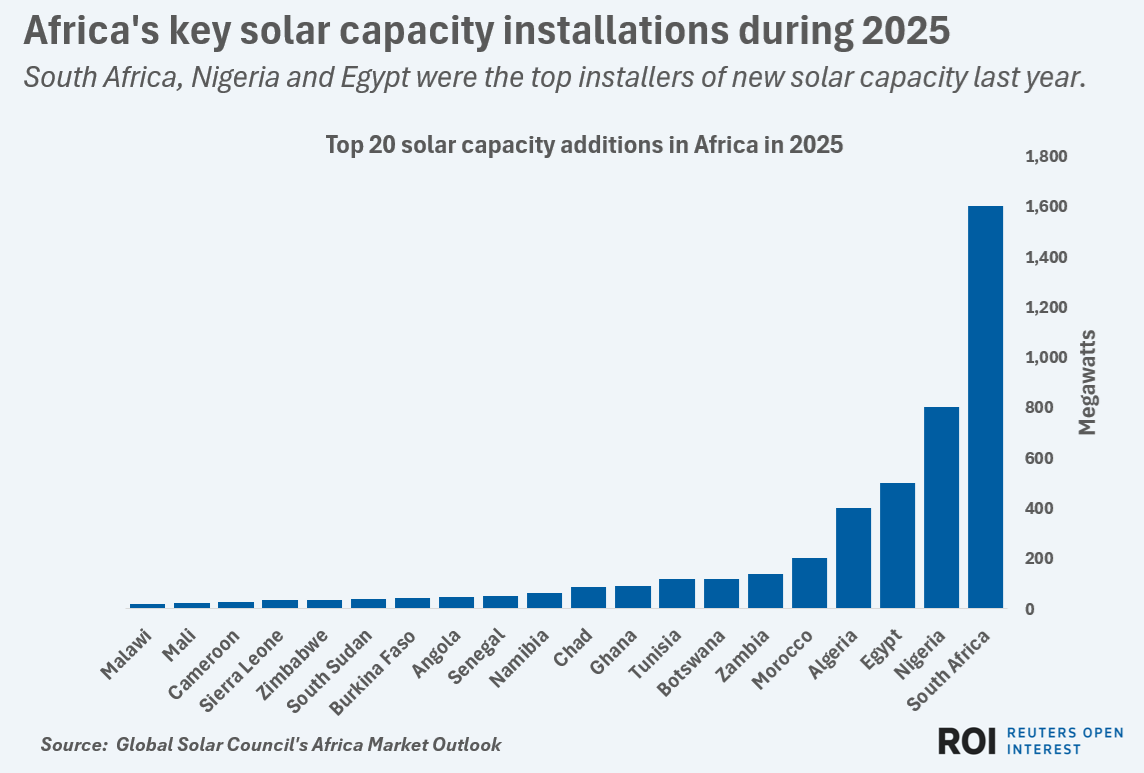 Africa installed a record 4.5 gigawatts (GW) of photovoltaic (PV) solar power capacity in 2025, according to the Global Solar Council, which marked a 54% jump from the year before.